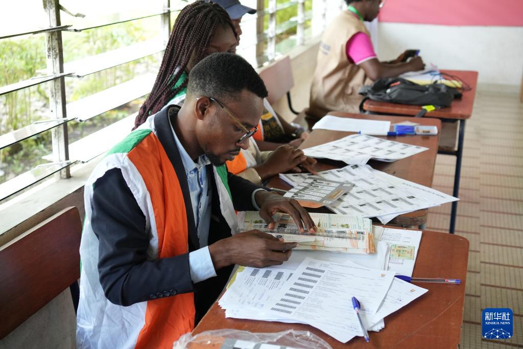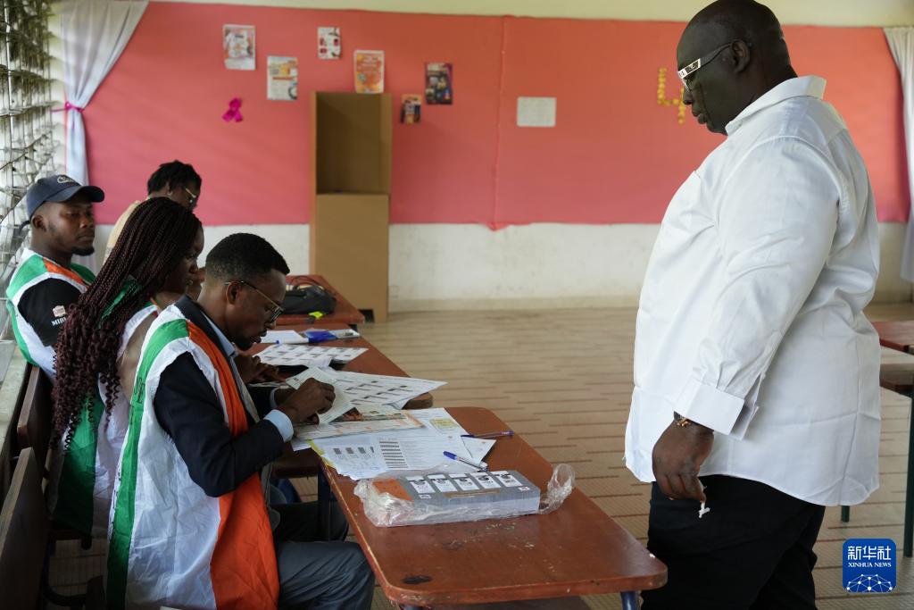 10月25日,工作人員在科特迪瓦經(jīng)濟(jì)首都阿比讓的一處投票站核實(shí)選民信息。