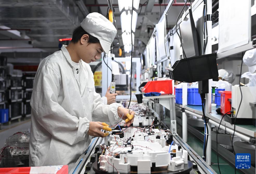10月10日,在廣東省惠州市,工作人員在石頭科技組裝車間流水線裝配掃地機器人。