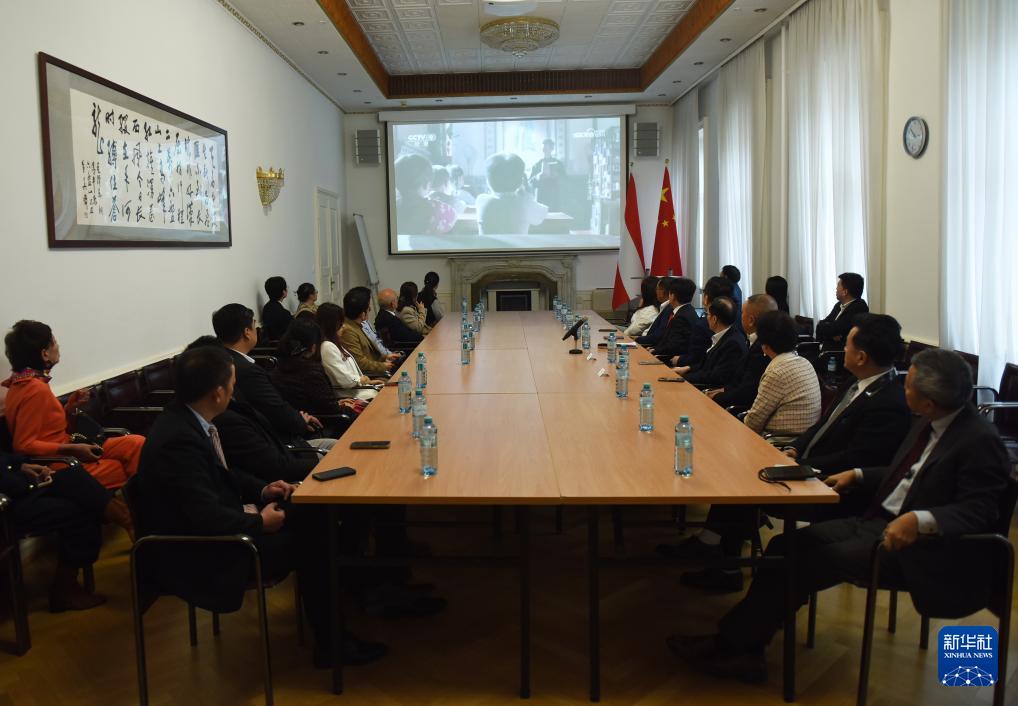 10月25日,在位于奧地利維也納的中國駐奧地利大使館,與會人員觀看《臺灣1945》紀錄片。新華社記者 賀燦鈴 攝