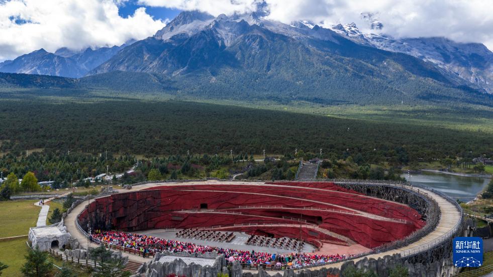 10月26日,游客在麗江市玉龍雪山景區(qū)觀看《印象麗江》演出(無人機(jī)照片)。