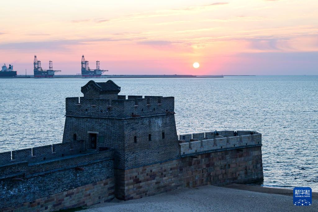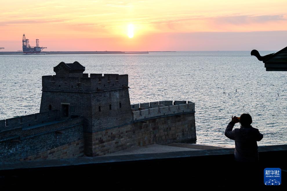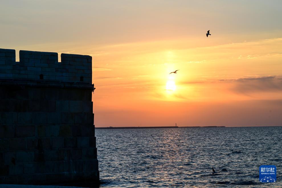 10月26日,沐浴在晨光中的河北秦皇島山海關老龍頭,與海面光影交錯,盡顯雄渾氣象。