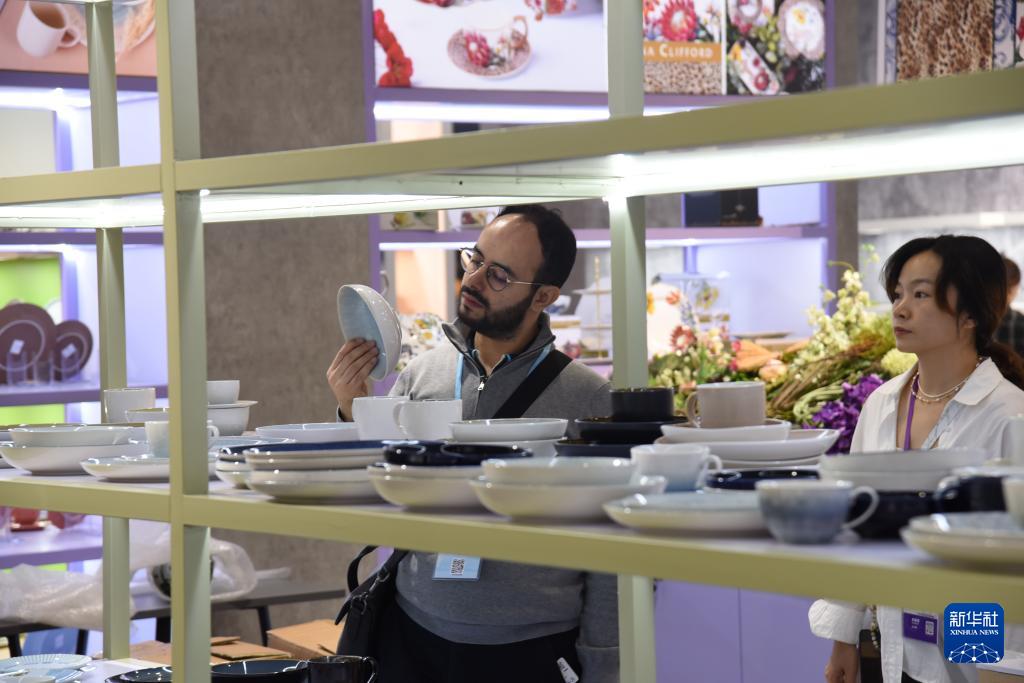 10月27日,采購商在第138屆廣交會第二期展會上查看瓷器餐具產品。