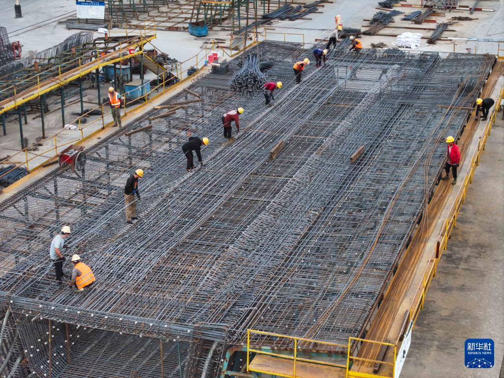 10月27日,工人在中鐵十一局滬渝蓉高鐵滬寧段搬經(jīng)制梁場作業(yè)(無人機照片)。