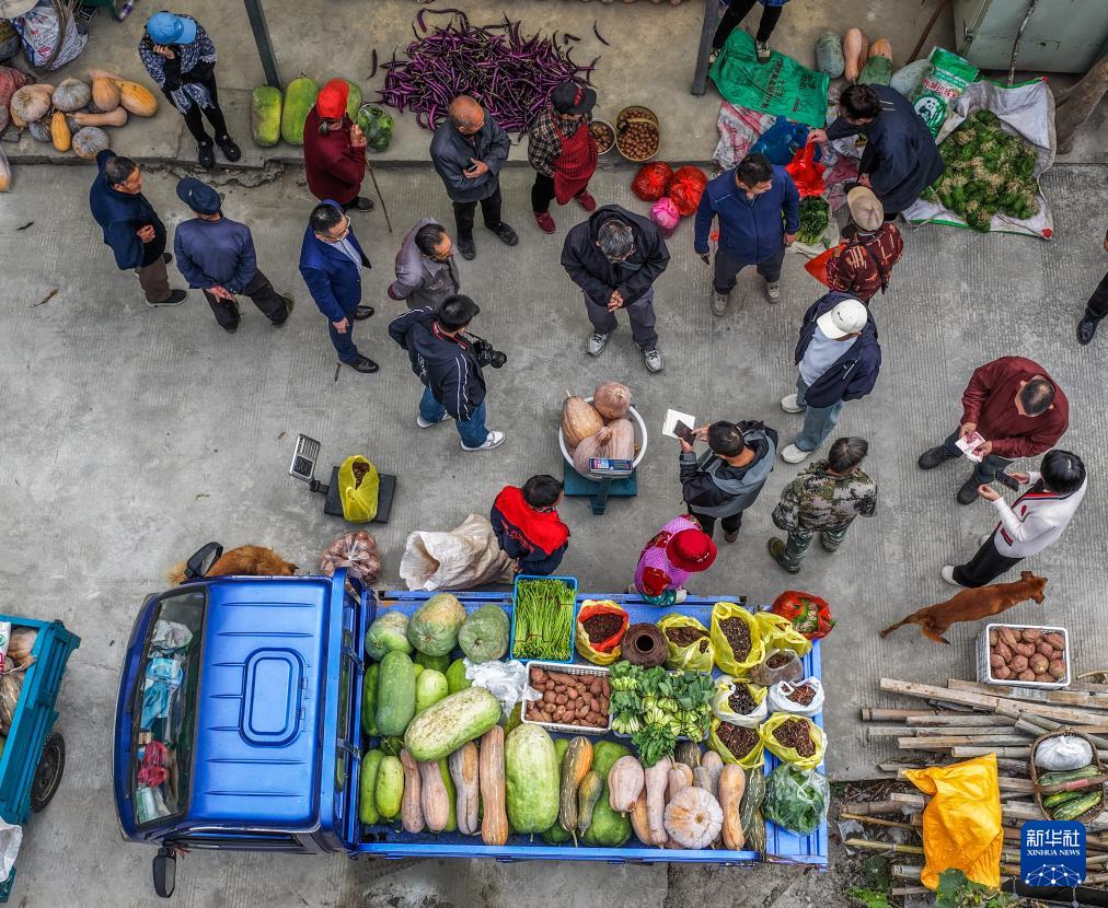 10月27日,愛心餐飲企業的工作人員在官田村收購村民們的各類農特產品(無人機照片)。