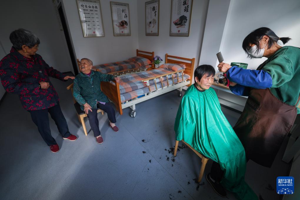 10月28日,在嘉興市南湖區七星街道湘城社區公共開放空間,志愿者為老人理發。