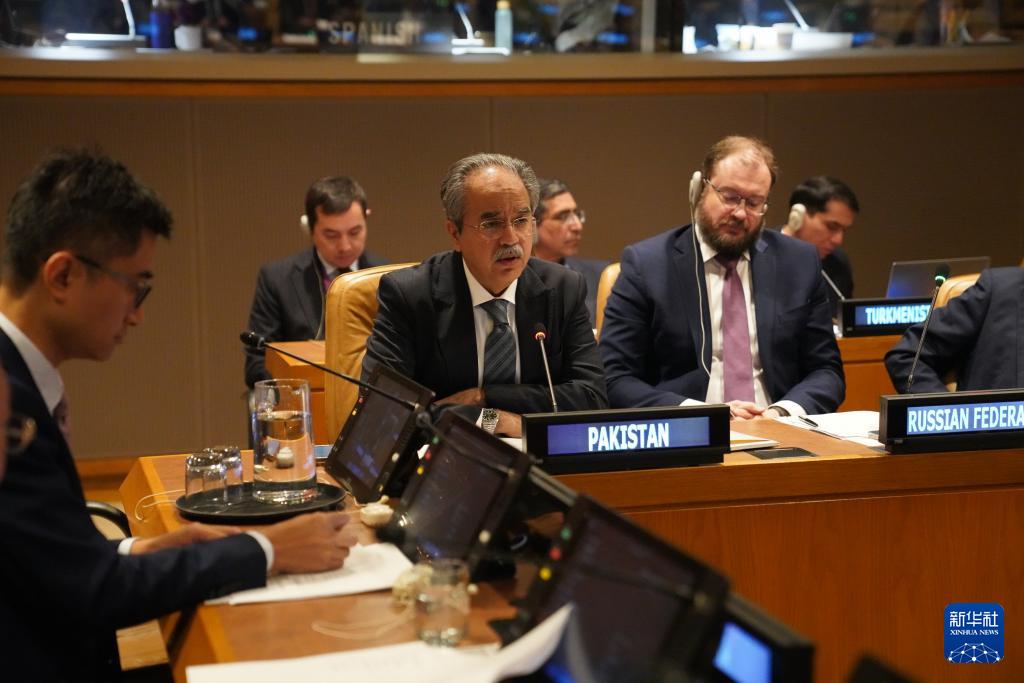 10月27日,在位于紐約的聯合國總部,巴基斯坦常駐聯合國代表阿西姆·伊夫蒂哈爾·艾哈邁德(中)在“紀念臺灣光復80周年,維護聯大第2758號決議權威”會議上發言。