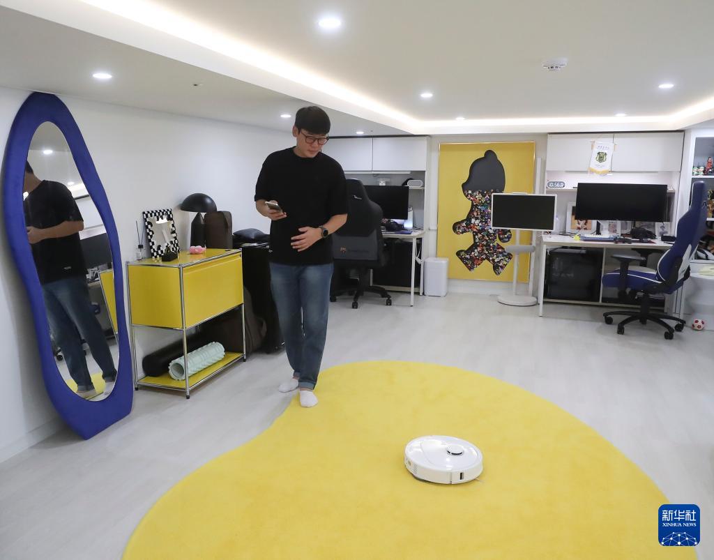 10月13日,韓國消費者閔普炫在首爾的家中使用掃地機器人。