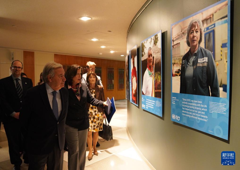 10月20日,在位于紐約的聯合國總部,聯合國秘書長古特雷斯(前)參觀“共棲生命,共享未來”慶祝聯合國成立80周年全球圖片展。