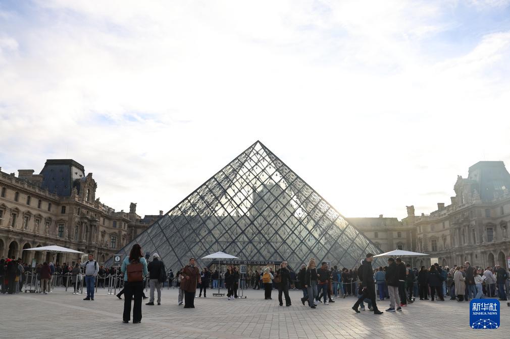 10月22日,在法國巴黎,大量游客聚集在盧浮宮博物館的玻璃金字塔入口前。