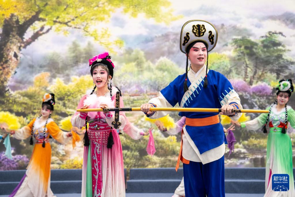 10月29日,在長沙市開福區東風路街道東風大舞臺,湖南藝術職業學院學生為市民表演戲曲《劉海砍樵》。