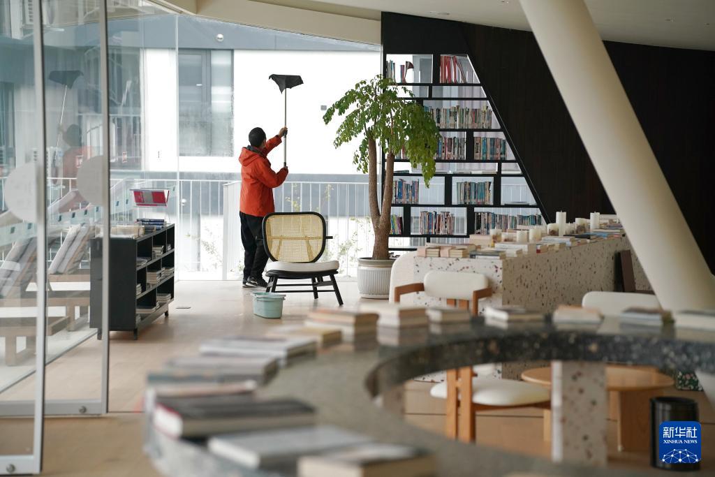 10月29日,在鎮坪縣牛頭店鎮國慶村,一家山居酒店工作人員在酒店書吧內打掃衛生。