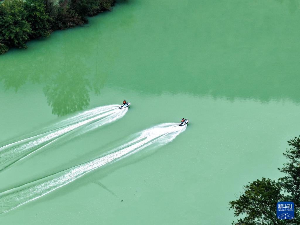 10月30日,水上運動愛好者在濯水古鎮旁的阿蓬江上體驗水上摩托艇(無人機照片)。