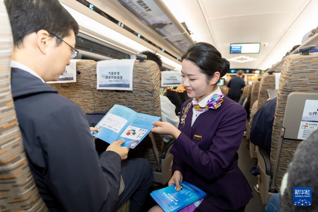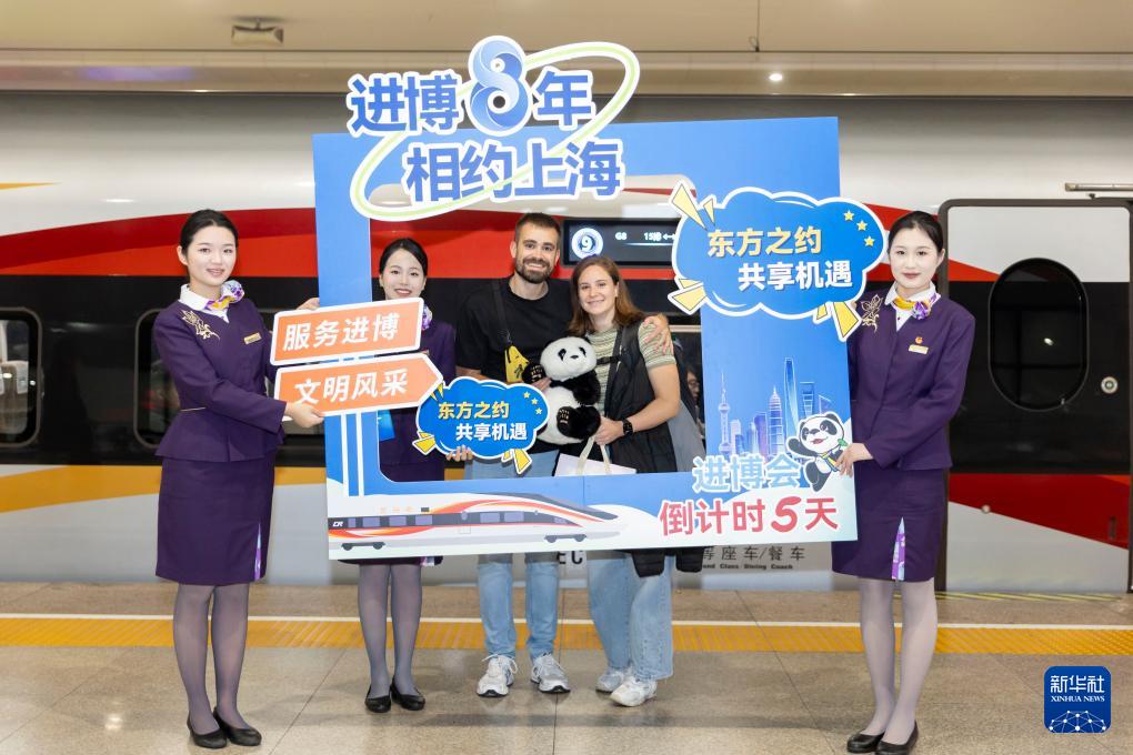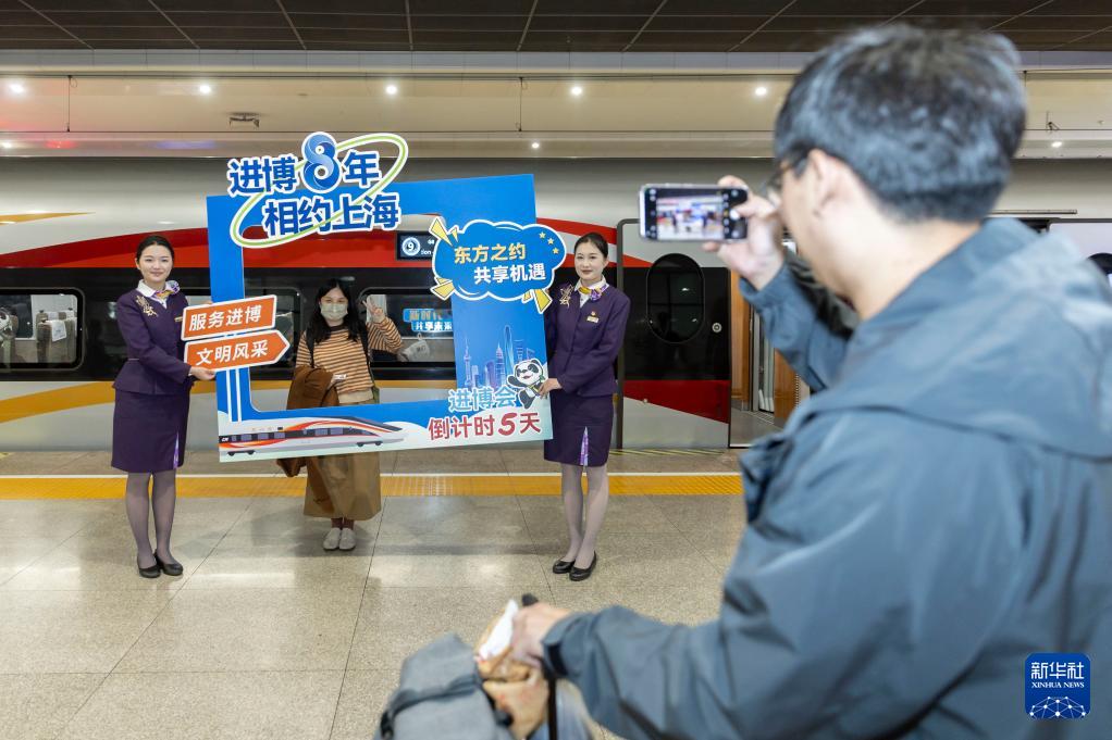 第八屆中國(guó)國(guó)際進(jìn)口博覽會(huì)開幕在即,中國(guó)鐵路上海局集團(tuán)有限公司上海客運(yùn)段在上海虹橋站開展“進(jìn)博8年 相約上海”主題活動(dòng),在G8次列車上向旅客介紹進(jìn)博會(huì)亮點(diǎn)。