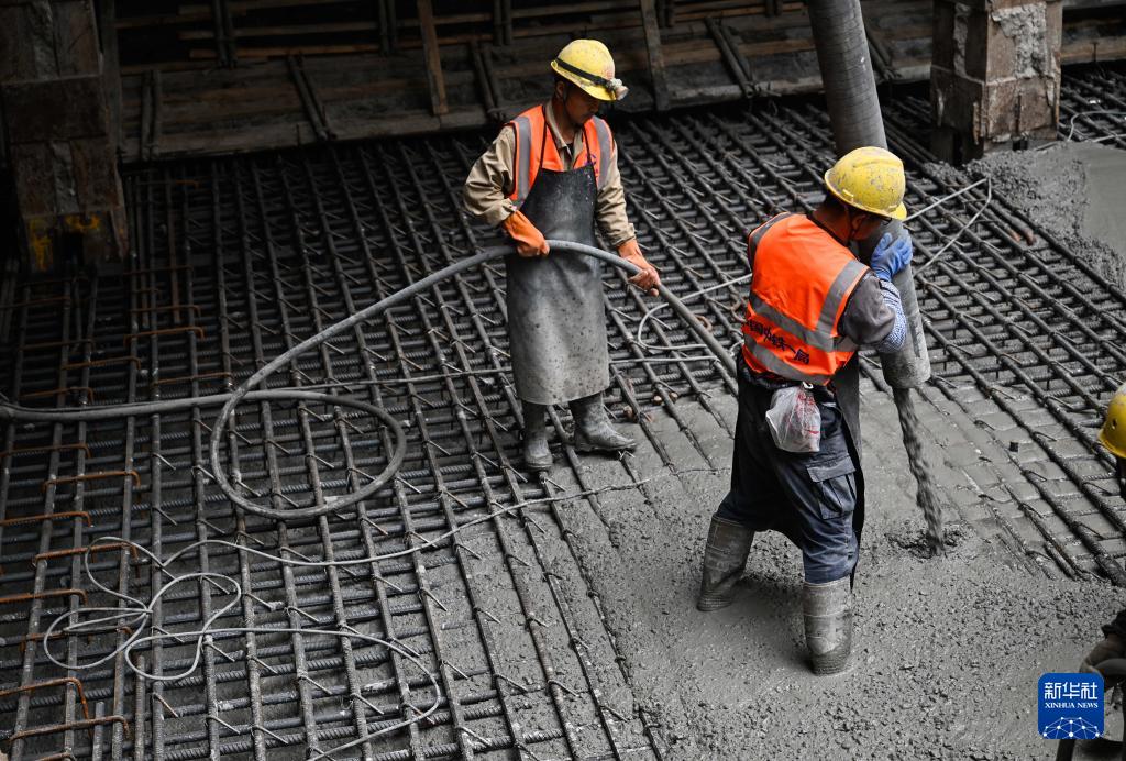 10月30日,工人在海門北站核心區(qū)基坑最后一塊底板澆筑現(xiàn)場(chǎng)作業(yè)。