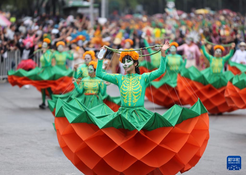 11月1日,在墨西哥首都墨西哥城,演員參加亡靈節(jié)游行。