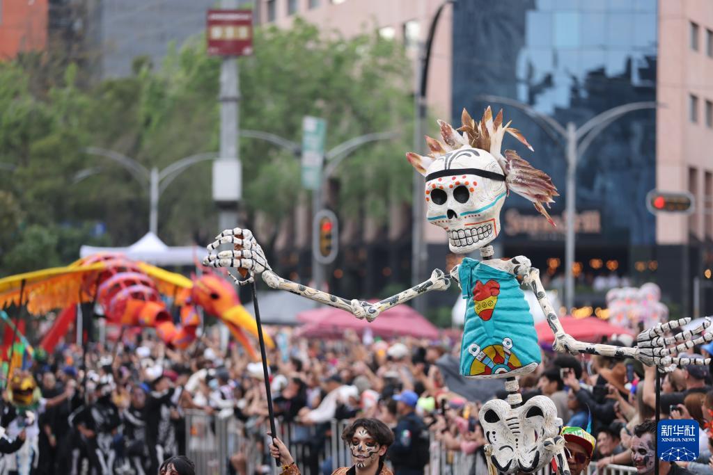11月1日,在墨西哥首都墨西哥城,演員舉著亡靈節(jié)裝置參加游行。