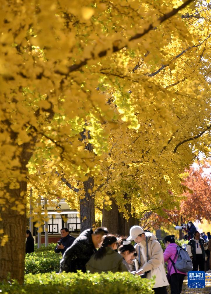 深秋時節,北京市街頭和公園內的銀杏等樹木掛滿黃葉,濃濃的秋色吸引大批市民踏秋賞景。
