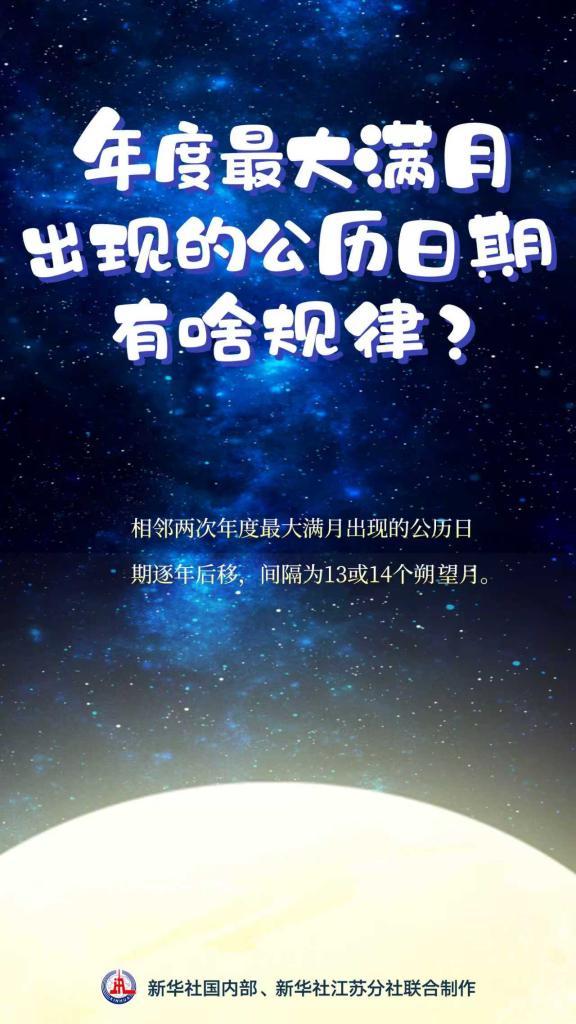 2024年最大滿月出現在10月17日、2023年出現在8月31日、2022年出現在7月14日……年度最大滿月出現的公歷日期有何規律?王科超表示,月球過近地點的平均周期約為27.55天,滿月出現的平均周期為29.53天,二者不同步,導致滿月位于近地點的時間逐漸向后“漂移”。具體來講,相鄰兩次年度最大滿月出現的公歷日期逐年后移,間隔13或14個朔望月。