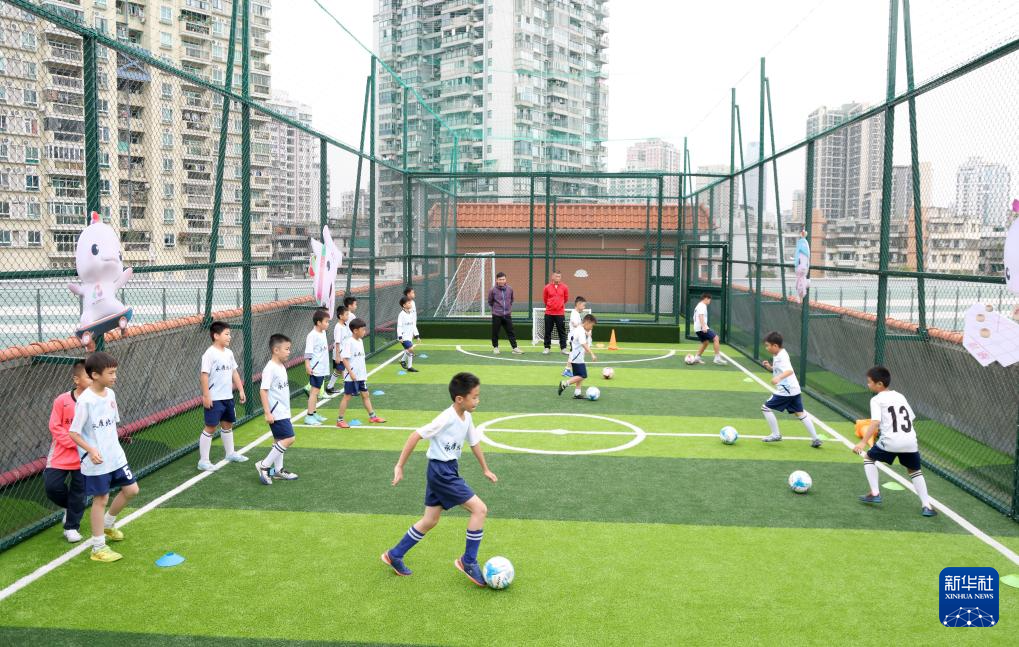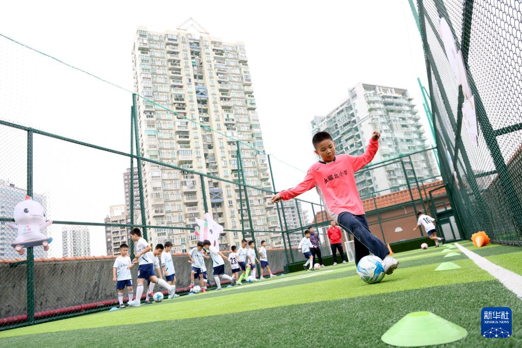 11月3日,廣州市永曜北小學的學生在學校樓頂天臺的足球場踢球。
