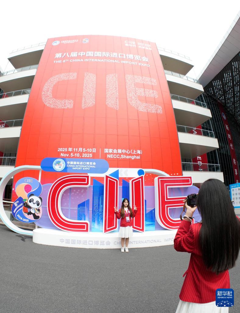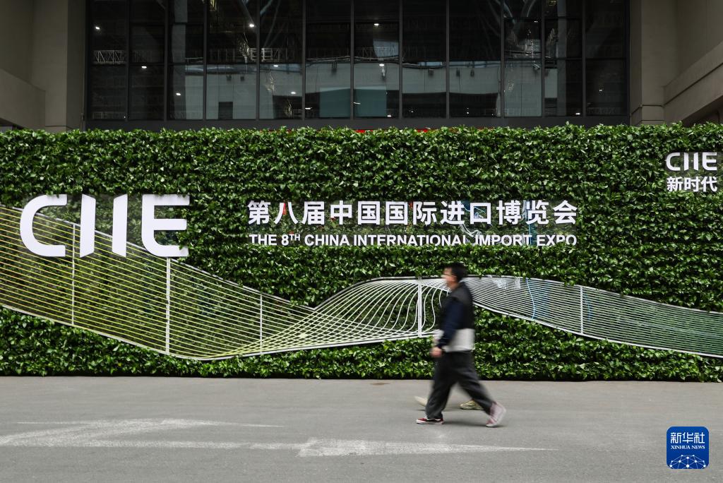 這是11月4日在第八屆進博會舉辦場地——國家會展中心(上海)拍攝的進博會宣傳標識。