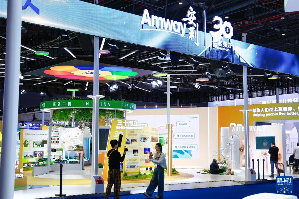 11月4日,工作人員在第八屆進博會的一個展位前錄制視頻。
