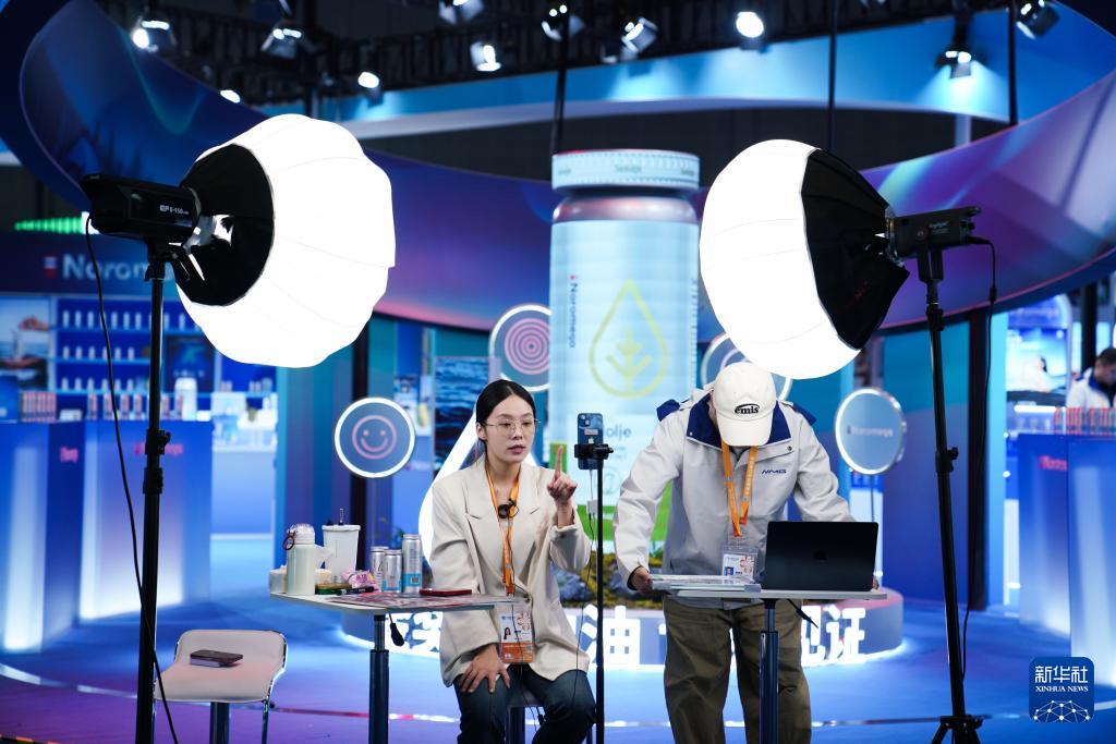 11月4日,工作人員在第八屆進博會醫療器械及醫藥保健展區直播。