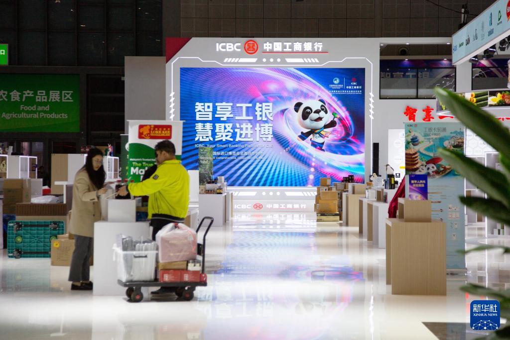 11月4日,工作人員在第八屆進博會農食產品展區進行準備工作。