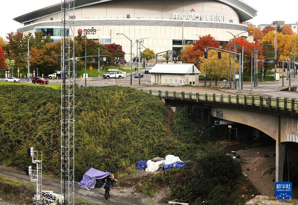 11月4日,在美國俄勒岡州波特蘭,無家可歸者在開拓者隊主場附近的橋下搭建帳篷棲身。