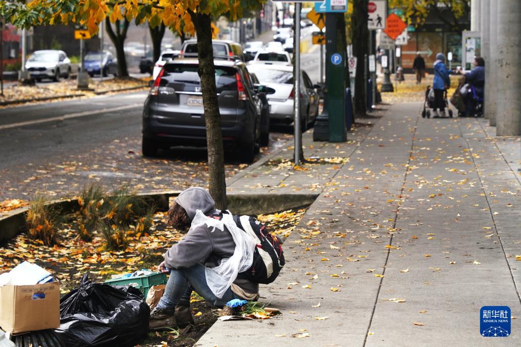 11月4日,在美國(guó)俄勒岡州波特蘭,無(wú)家可歸者坐在路邊垃圾旁。