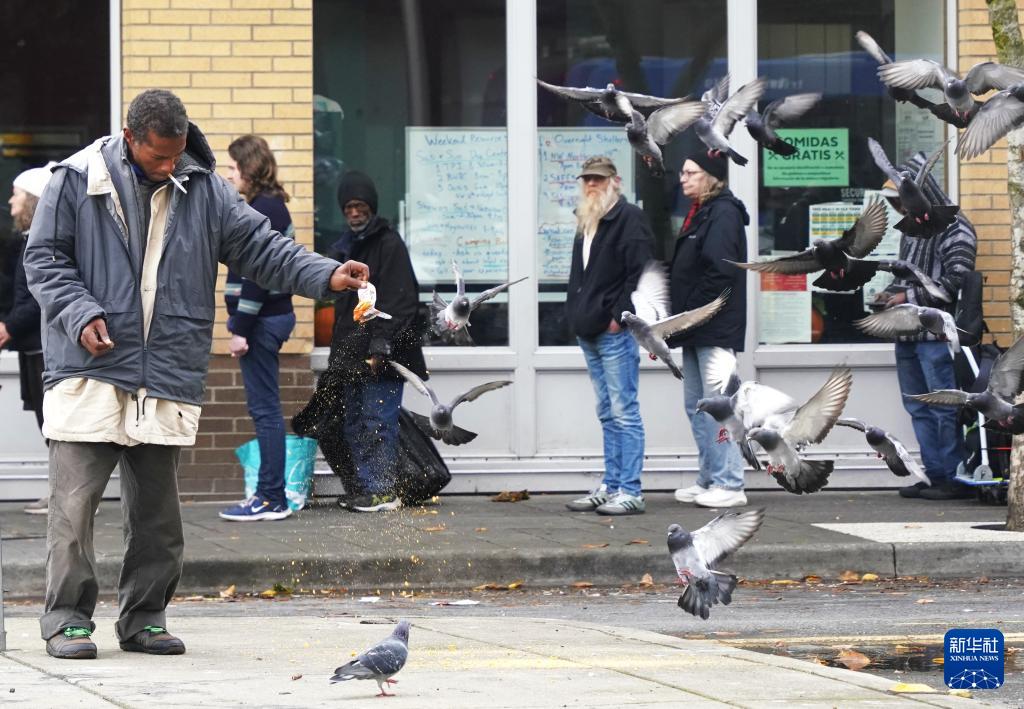 11月4日,在美國(guó)俄勒岡州波特蘭,無(wú)家可歸者在街頭喂鴿子。