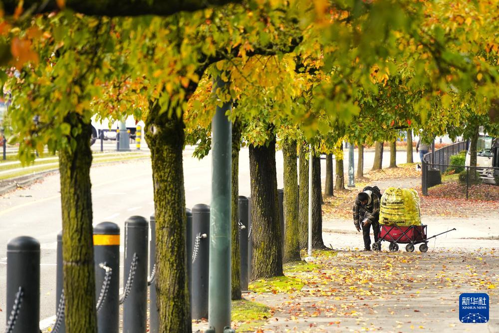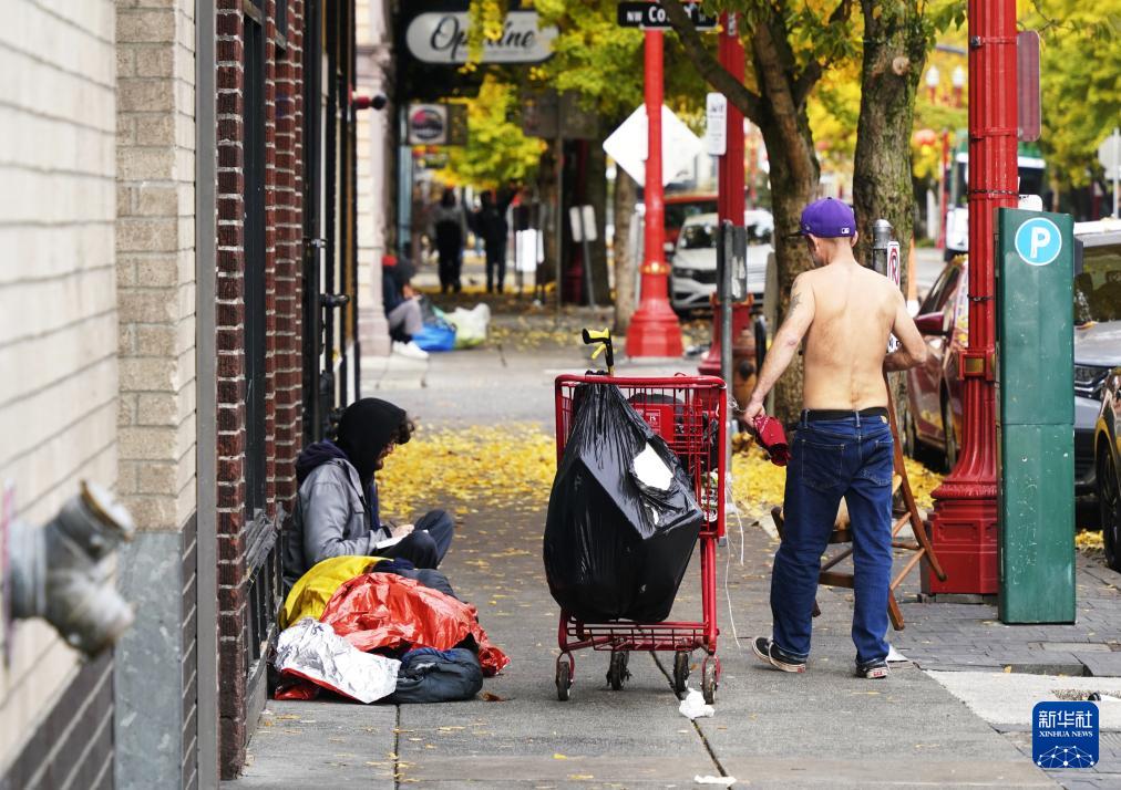 11月4日,在美國(guó)俄勒岡州波特蘭,無(wú)家可歸者在街頭拾荒。