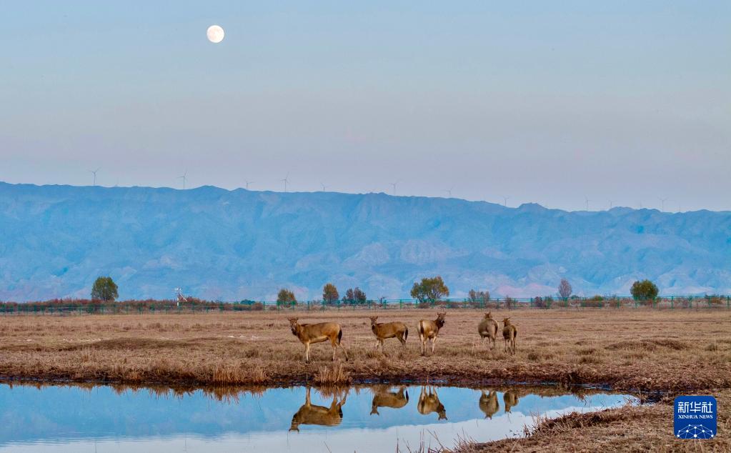 青銅峽庫區濕地自然保護區總面積174.93平方公里,是寧夏最大的黃河灘涂類型濕地。2024年9月底,35頭麋鹿落戶青銅峽庫區濕地自然保護區,經過一個月適應期后被野放在200余畝的圍欄內。目前,隨著6只麋鹿幼崽的誕生,當地麋鹿種群繁育工作邁入新階段,放歸區域從200余畝擴展至3000余畝,保護工作也從遷地擴繁轉向野化放歸,開啟了黃河流域寧夏段生物多樣性保護的新篇章。