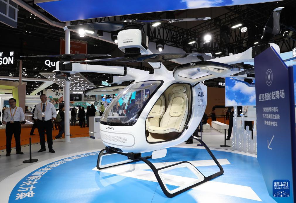 11月5日,人們在第八屆進博會汽車及智慧出行展區御風未來展臺觀看、了解電動垂直起降飛行器。