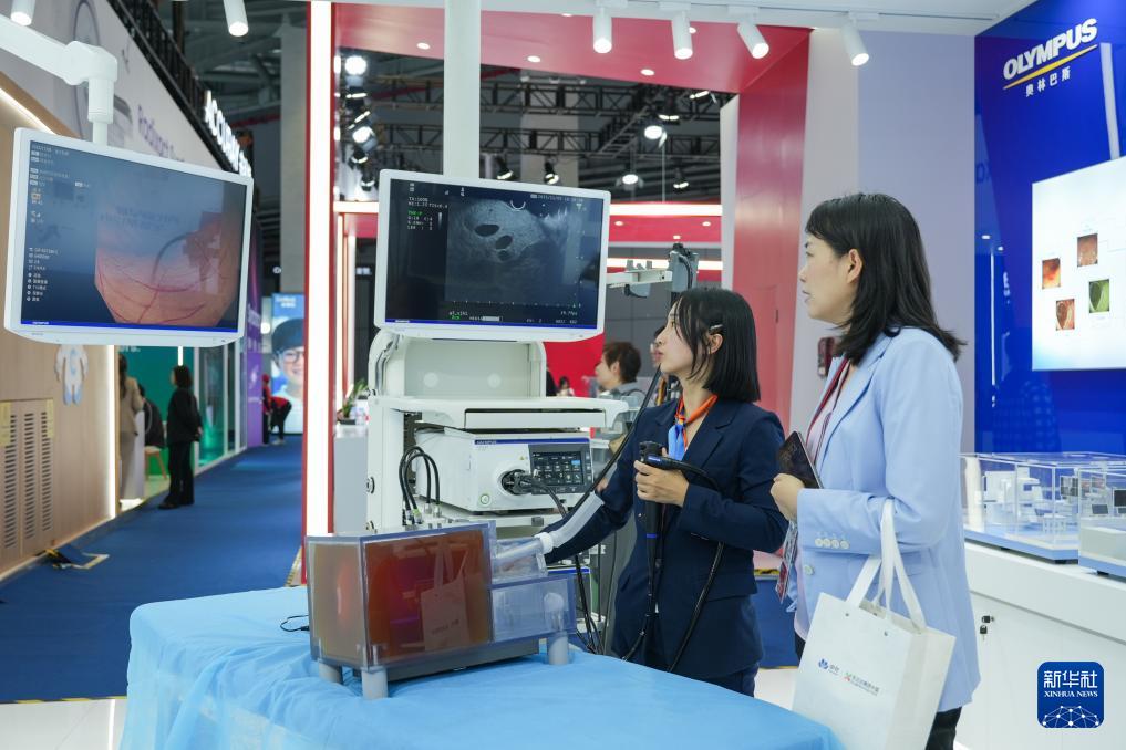 11月5日,在第八屆進博會醫療器械及醫藥保健展區奧林巴斯展臺,工作人員演示消化內鏡系統。