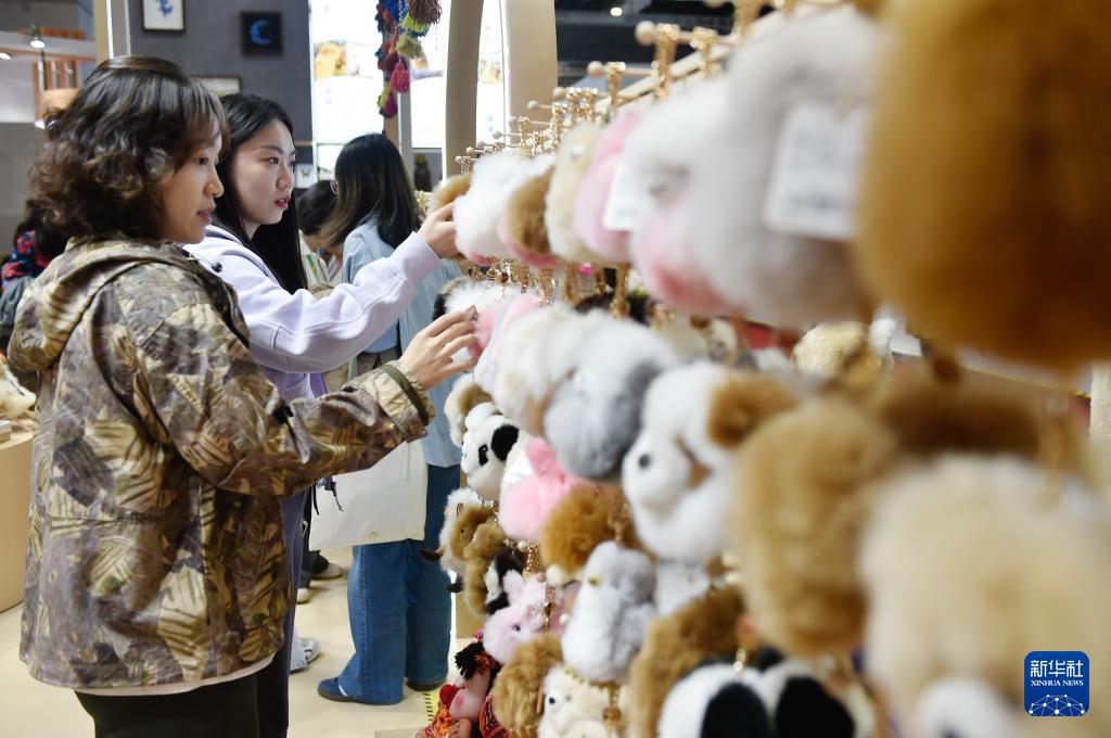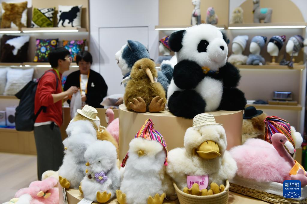 11月5日,觀眾在第八屆進博會消費品展區選購毛絨玩具。