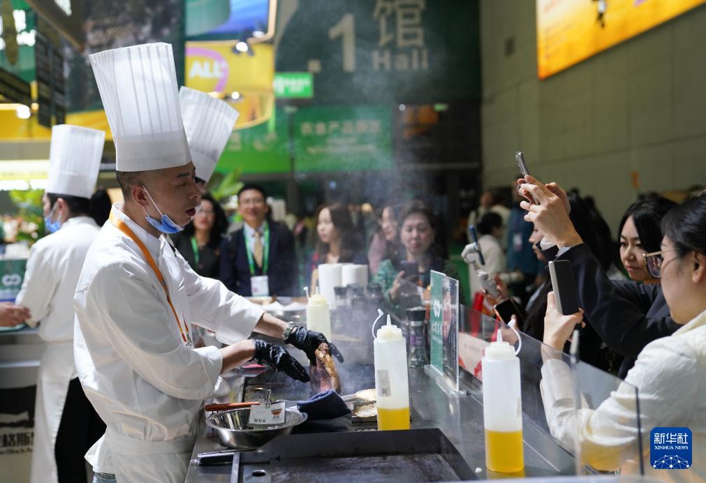 11月5日,參展商工作人員在第八屆進博會農食產品展區現場制作食物。