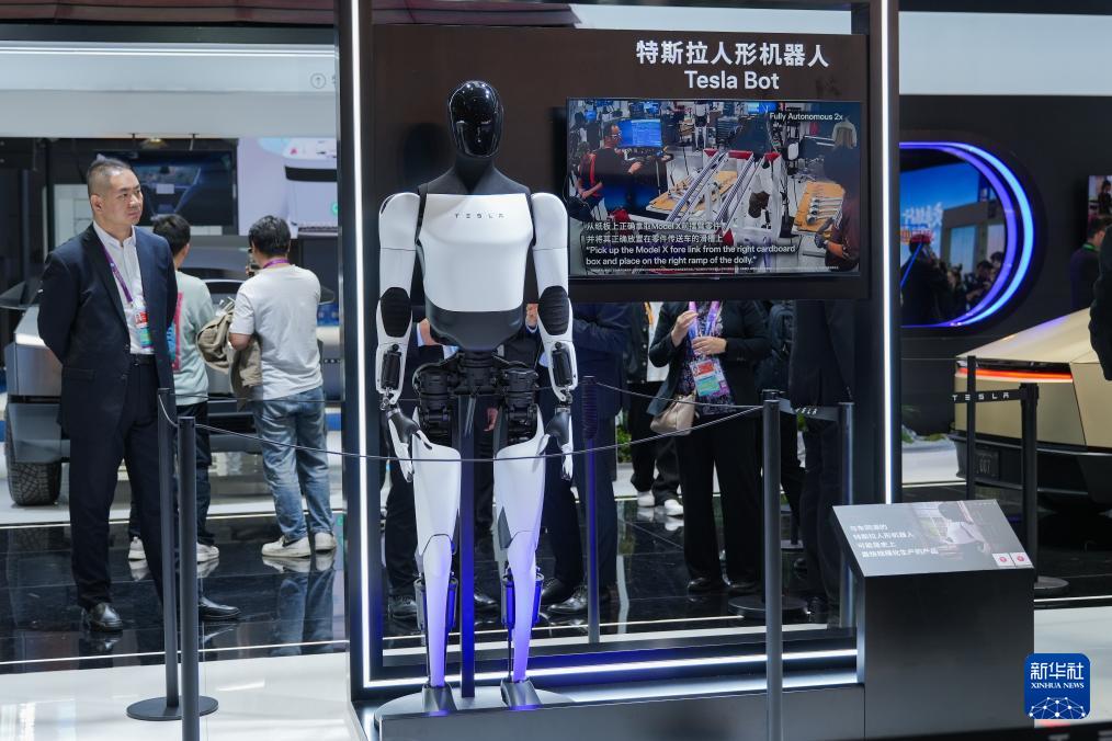 這是11月5日在第八屆進博會汽車及智慧出行展區特斯拉展臺拍攝的特斯拉人形機器人。