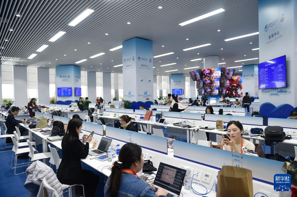 11月5日,媒體記者在第八屆進博會新聞中心內工作。