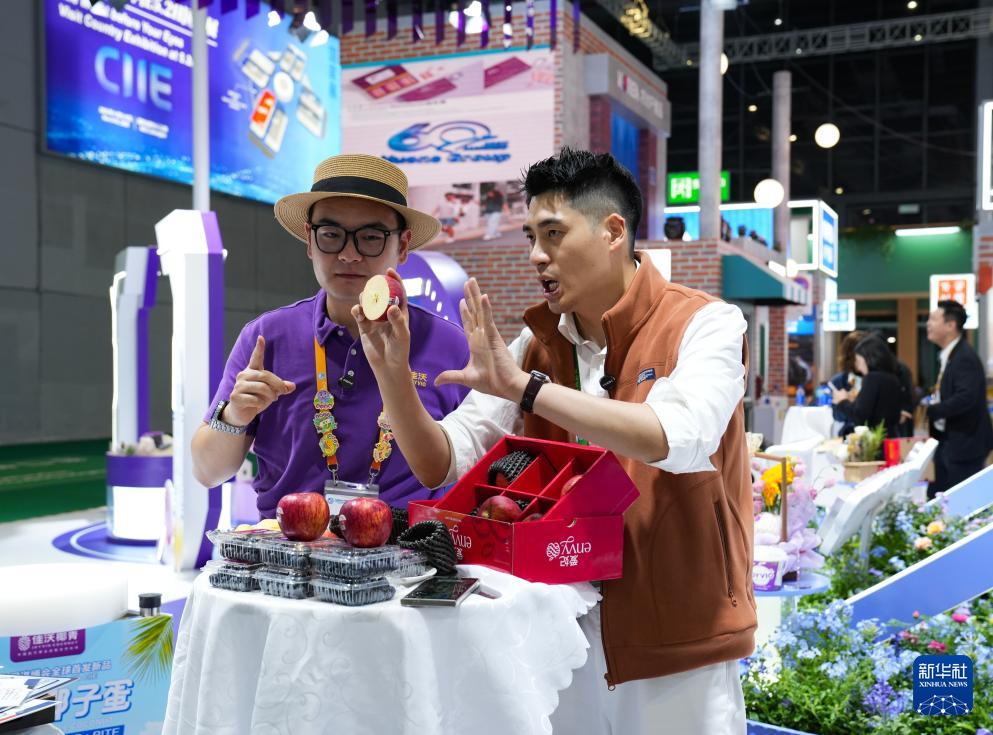 11月5日,參展商在第八屆進博會農食產品展區直播賣貨。