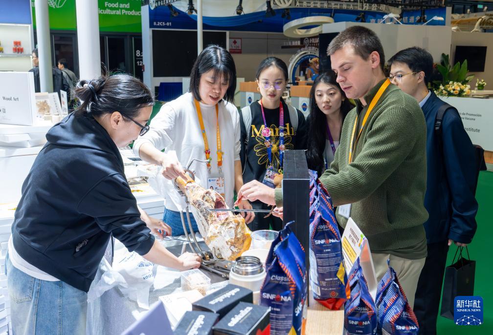 11月5日,在第八屆進博會農食產品展區,參展商為觀眾介紹伊比利亞火腿。