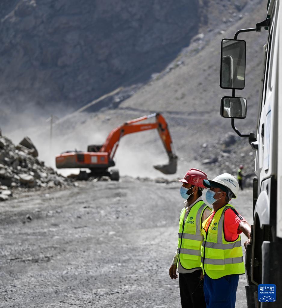 這是9月11日在塔吉克斯坦卡拉依洪姆村附近拍攝的中塔公路二期工程施工現(xiàn)場。