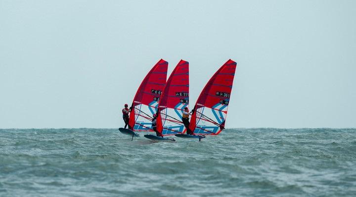 10月30日,浙江隊選手閆錚(右)在第十五屆全運會帆船項目女子水翼帆板級比賽中。新華社記者 晉美多吉 攝