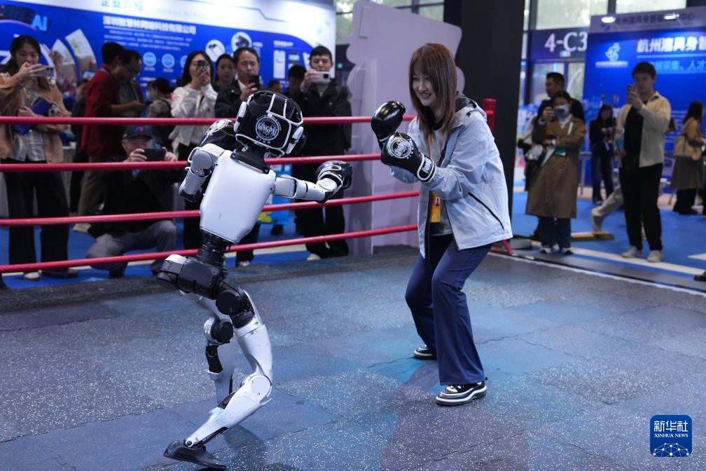 11月6日,觀眾在2025年世界互聯網大會“互聯網之光”博覽會現場體驗與宇樹科技G1機器人“格斗”。