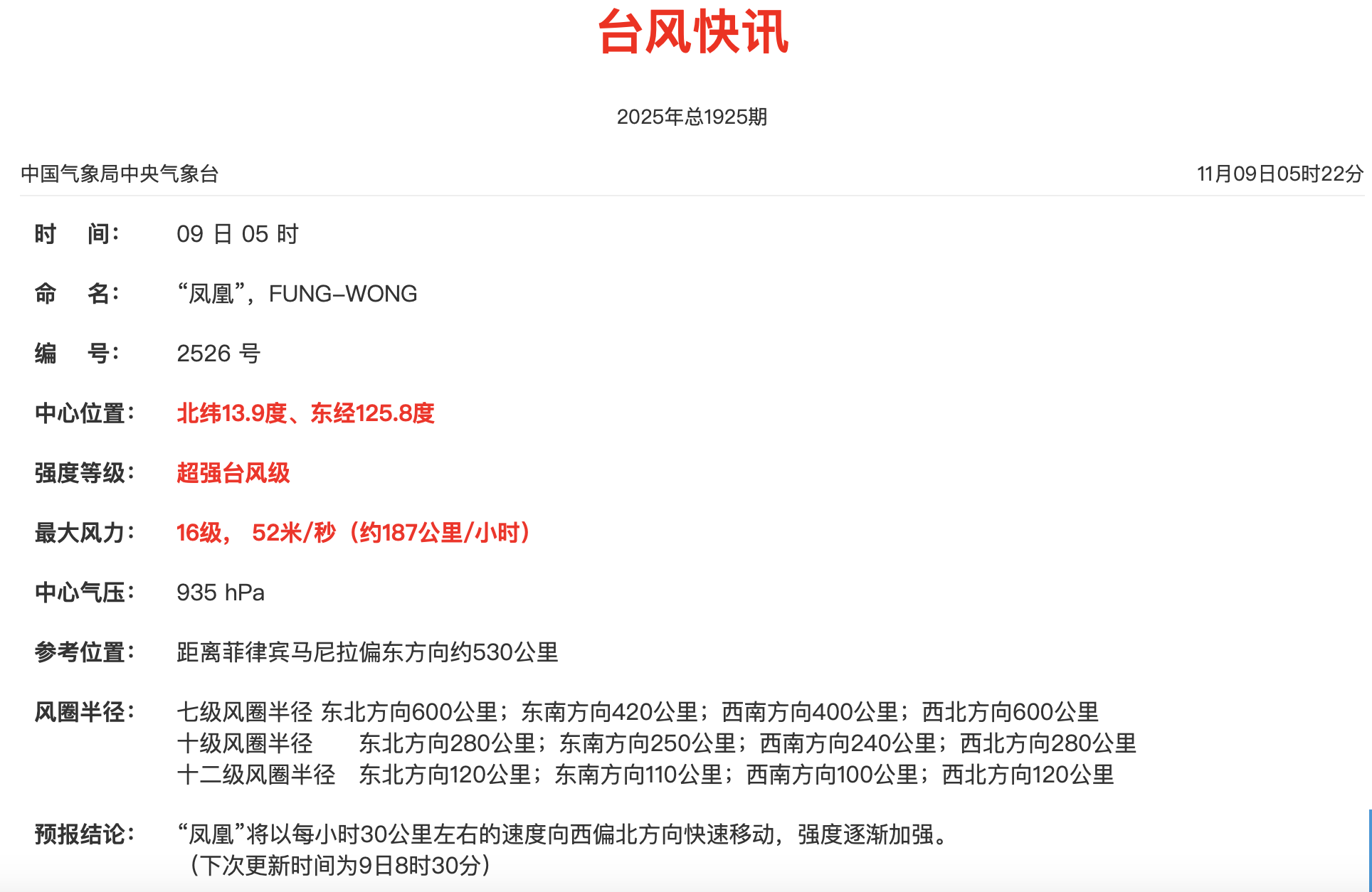 今年第26號臺風“鳳凰”已于今天(9日)凌晨加強為超強臺風級,今天早晨5點鐘其中心位于菲律賓馬尼拉偏東方向大約530公里的西北太平洋洋面上,就是北緯13.9度、東經125.8度,中心附近最大風力有16級(52米/秒),中心最低氣壓為935百帕,七級風圈半徑400-600公里,十級風圈半徑240-280公里,十二級風圈半徑100-120公里。