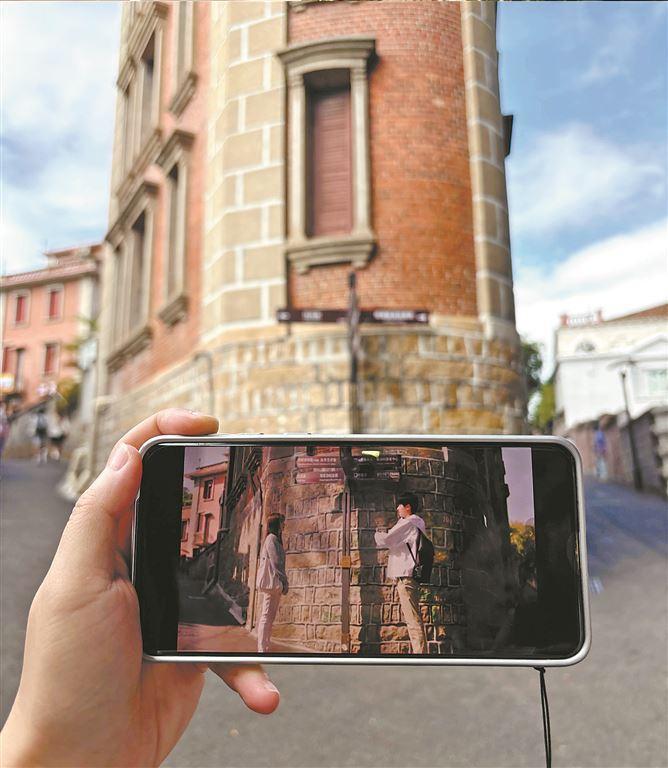 鼓浪嶼“最美轉角”是電視劇《暗戀·橘生淮南》中的浪漫地標,游客將手機屏幕中的劇照和現場原址對比拍照留念。