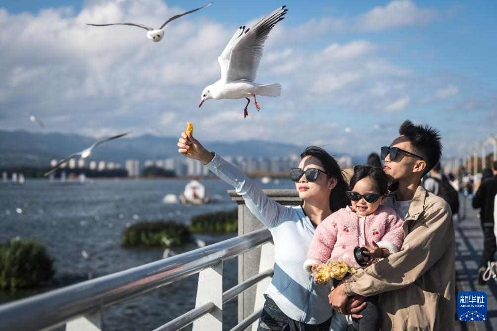 11月10日,游客在云南省昆明市海埂大壩投喂紅嘴鷗。