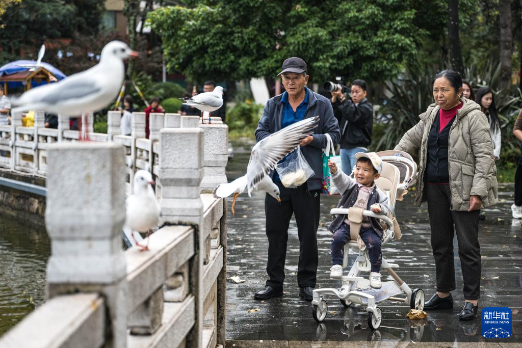 11月10日,游客在云南省昆明市翠湖公園內投喂紅嘴鷗。