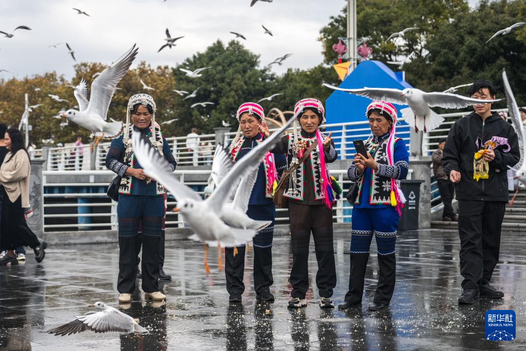 11月10日,游客在云南省昆明市海埂大壩投喂紅嘴鷗。