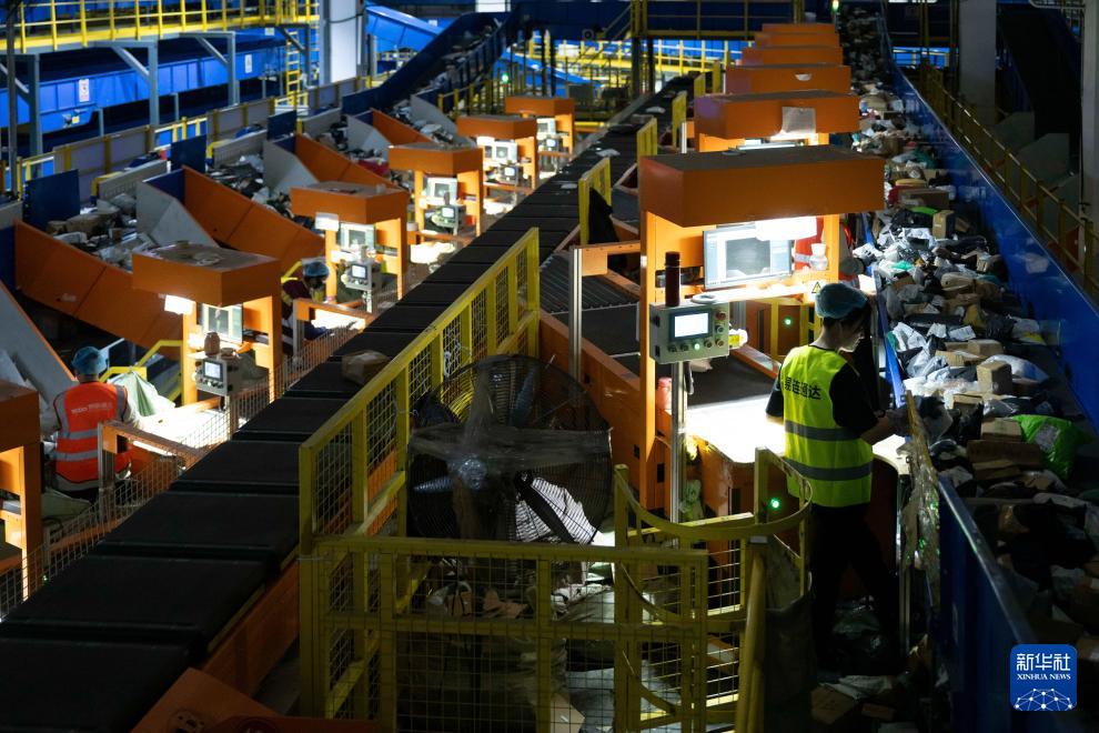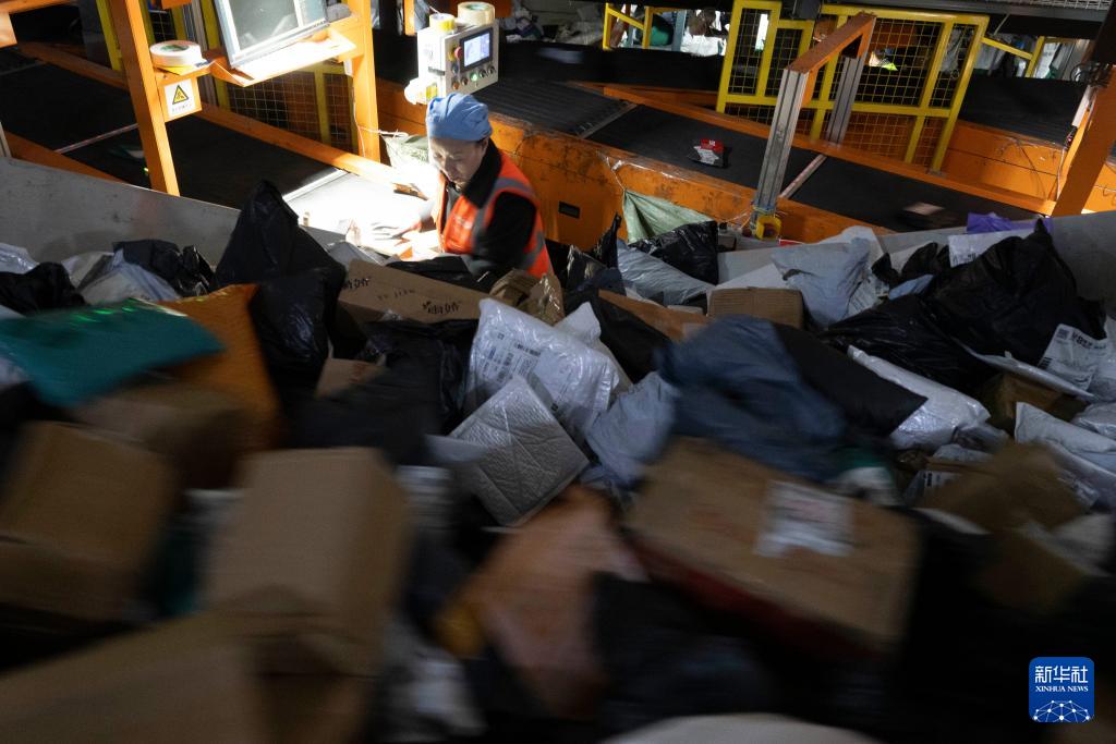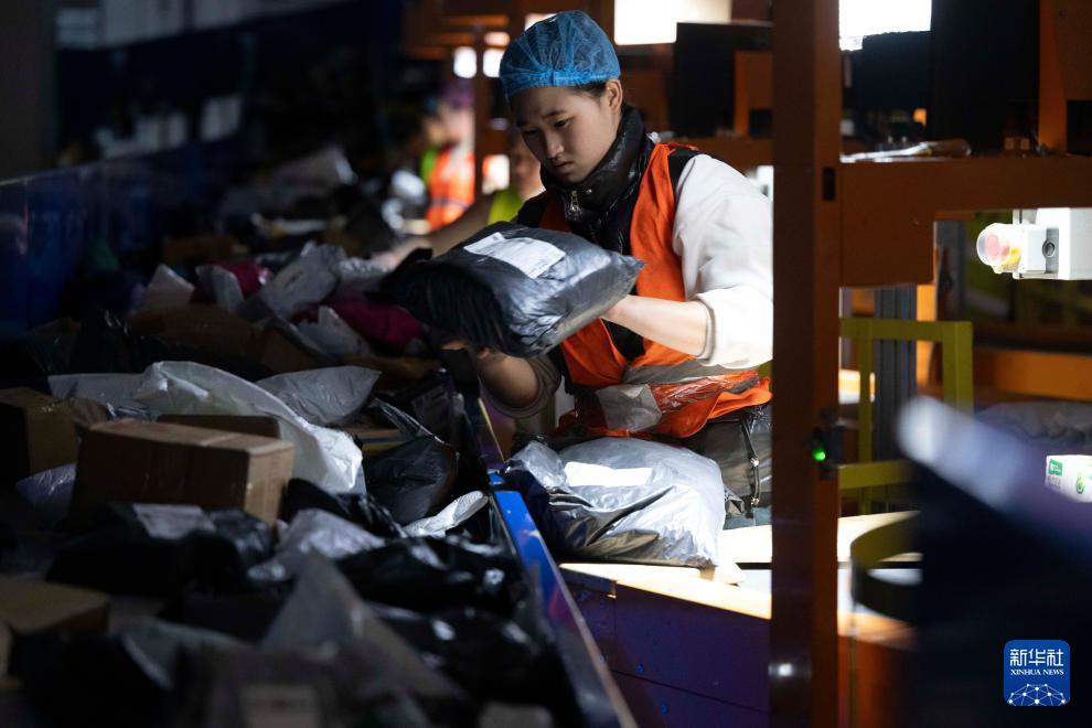 11月10日晚,在中國郵政集團有限公司黑龍江省哈爾濱郵區中心,工作人員在分揀快遞。