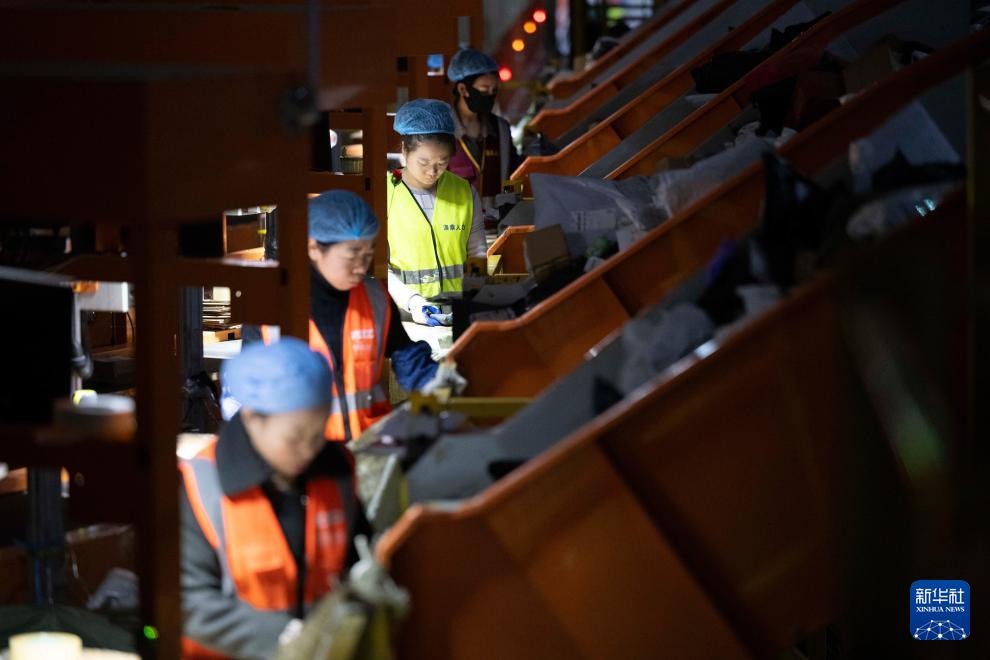 11月10日晚,在中國郵政集團有限公司黑龍江省哈爾濱郵區中心,工作人員在分揀快遞。